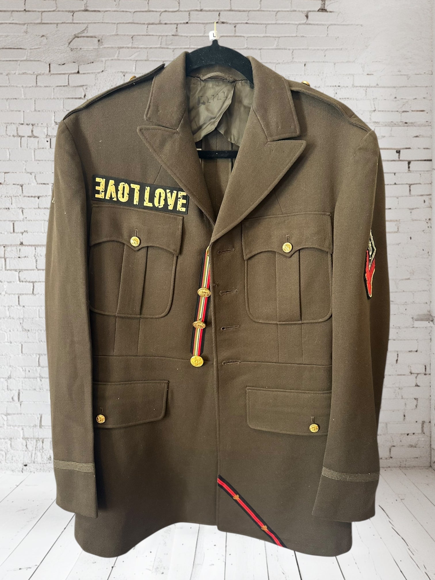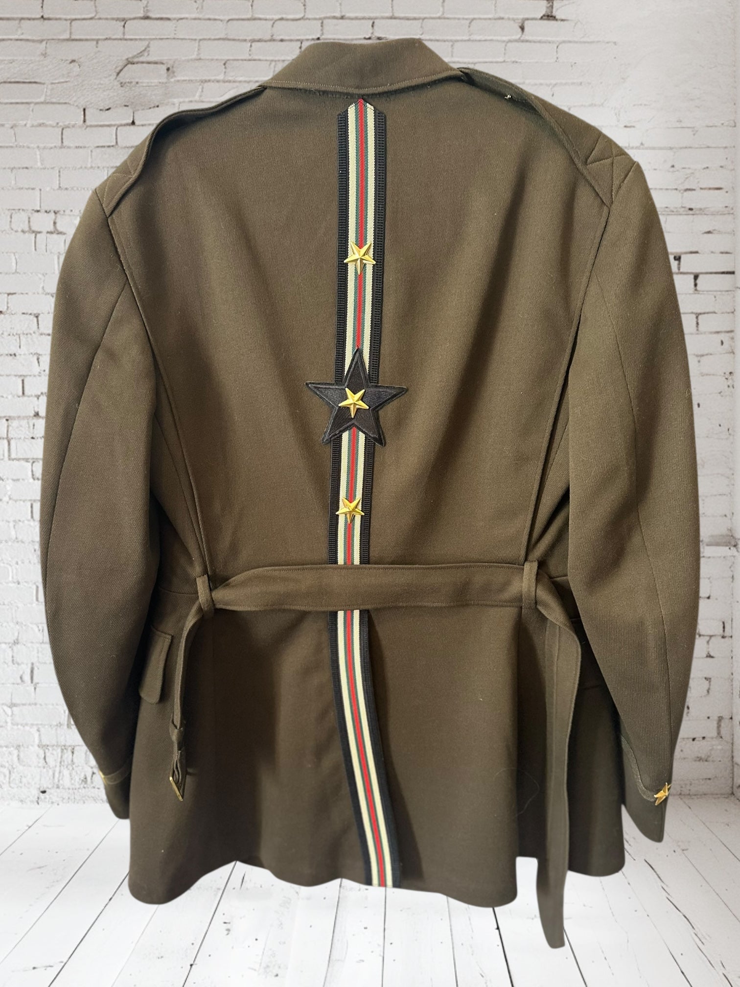 Legit wool Military Officer’s blazer. This beaut has cool star details in the back with elegant trims & buttons on the back. Very cool! Dry Clean Only